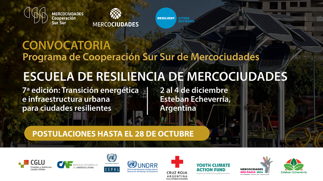 El Programa de Cooperación Sur Sur de Mercociudades y la Red de Ciudades Resilientes, invitan a funcionarias y funcionarios de Gobiernos locales de las «mercociudades» a postularse para participar en la 7ª edición de la Escuela de Resiliencia. Se realizará los días 2, 3 y 4 de diciembre en modalidad presencial en Esteban Echeverría, Argentina. La formación es gratuita, cubre pasajes internacionales, hospedaje y alimentación. Postulaciones abiertas hasta el 28 de octubre de 2024.